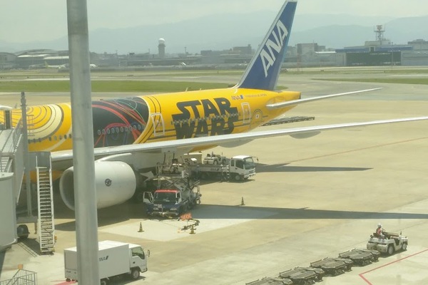 Ich habe nicht durchschaut, was genau der Trick war, aber das Boarding verlief erstaunlich entspannt, reibungslos und schnell ab. Alle schlenderten gefühlt zum Gate, gingen durch, setzten sich und ab dafür! Etwas irritiert war ich, als im Flugzeug die ganze Zeit das "Star Wars"-Theme lief. Und kurz vor dem Start die Stewardessen auch noch ziemlich alberne Star-Wars-Westen überziehen mussten. Nach der Landung in Fukuoka habe ich dann das Flugzeug gesehen. Kann man machen.