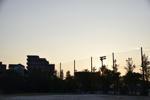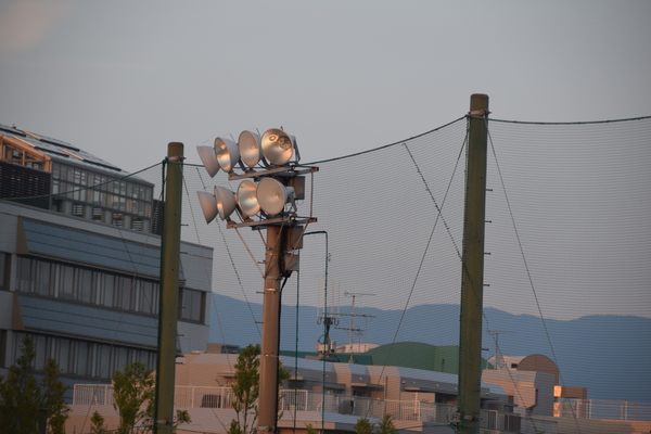 Langsam aber sicher geht die Sonne unter. Das ist dann auch relativ schnell an der Temperatur spürbar. Sprich: Außentemperaturen unter 30 Grad. Aber dafür steigt in der Regel die Luftfeuchtigkeit. Und das kann ziemlich unangenehm werden. Mittig am oberen Ende des Ballfangzaunes befindet sich eine altmodische Flutlichtanlage. Die gilt es, auf dem nächsten Bild ein wenig zu bewundern.