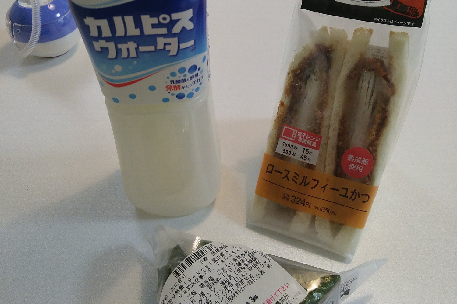 Dazu gab es ein Sandwich mit einer Art Schnitzelwurst. Wirklich sehr würzig und schmackhaft, aber auch leider etwas überteuert. 350 円 (= Yen, in Japan aber En gesprochen) sind etwa 2,70 €. Das Onigiri hat um einen Euro gekostet, das ist mal Value for Money. Und in der großen Getränkelotterie gab es heute japanisches Wal-Sperma. Das schmeckt zwar nicht so gut, soll aber Glück für die Onigiri-Lotterie bringen. Nein, Quatsch. Das ist カルピス (Calpis, gesprochen karupisu), ein Softdrink auf Milchbasis. So in etwa hat er auch geschmeckt. Also eher nicht so gut. Im Westen wird der Drink als Calpico verkauft. Was ist denn an car piss auszusetzen gewesen?