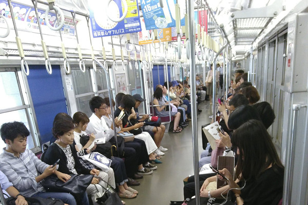 Und als Rausschmeißer gibt es noch einen Eindruck, wie es in so einer japanischen S-Bahn so aussieht. Eigentlich so, wie man es sich vorstellt. Ich glaube, die spielen alle Candy Crush Saga und Quizduell. Was man nur erahnen kann: Es ist wirklich supersauber (nicht nur in der Bahn) und angenehm entspannt und leise. Keine lauten Gespräche, kein Herumgeprolle, keine Telefonate und - eine der schlimmsten Krankheiten unserer Zeit - irgendwelche Arschgeier, die ihre Mitmenschen mit ihrer lauten Schrottmusik aus dem Smartphone belästigen. Das werde ich garantiert vermissen.