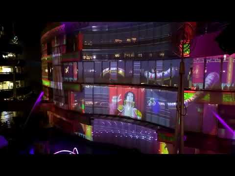 Die Projektionsfläche ist übrigens das fünf Stockwerke hohe Hyatt Hotel, das an der Stelle die eine Wand des Windkanals bildet.