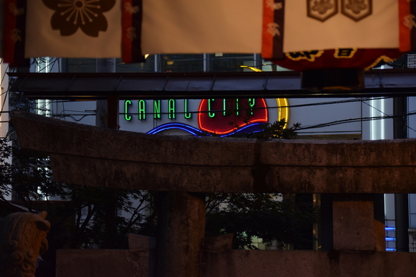[Spoilerwarnung an meine "Reisegruppe": Das, was ab hier steht, machen wir vermutlich Ende August auch. Also weiterlesen auf eigene Gefahr!] Wir hatten zwei Ziele, die direkt nebeneinander lagen. Er ging es zum 櫛田神社 (Kushida Schrein) und danach in die キャナルシティ博多 (Canal City Hakata). Das ist eine Shopping Mall mit einem Kanal (und Hakata ist ein Teil von Fukuoka, war mal eine eigene Stadt, dann sind sie ineinandergewachsen und Fukuoka hat gewonnen).