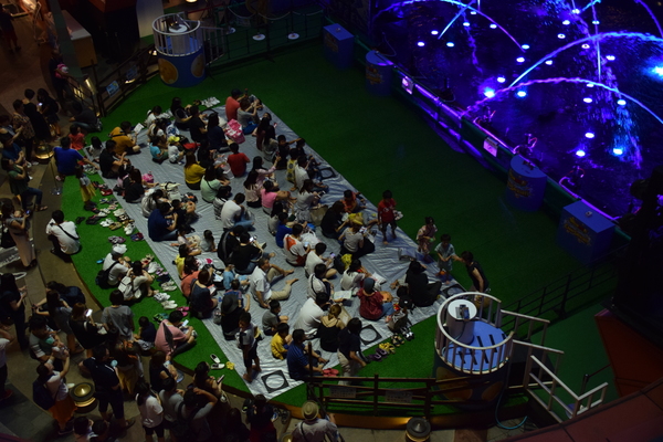 Zu jeder vollen Stunde gibt es im Zentrum der Mall eine Wassershow. Und in der Sommerzeit abends immer besonderes Programm. Dieses Jahr Dragonball, One Piece und Godzilla. Als wir ankamen, wartete bereits eine ganze Menge Leute auf die One-Piece-Show. Auf dem Bild oben sieht man, wie sich die Galerien füllen. Im Erdgeschoss vor den Fontänen gab es einen abgesperrten Bereich, in dem Eltern mit ihren Kindern auf Ruffy und seine Crew warteten.