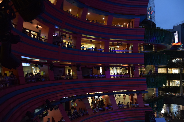 Canal City ist eins der größten Einkaufscenter Japans. Über 300 Geschäfte erstrecken sich auf fünf Etagen. Das wohl Spannendste an Canal City ist, dass es ein ungewöhnliches Kühlkonzept hat. Anstatt oben einen Deckel draufzusetzen und überall Klimaanlagen zu installieren, ist ein Großteil des Centers offen. Der Außenbereich ist wie ein Windkanal gebaut und im Erdgeschoss fließt ein künstlicher Kanal. Durch den Wind und die Verdunstung soll es ganz angenehm sein. Ob das Konzept wirklich funktioniert, weiß ich nicht. Als wir angekommen sind, war die Sonne bereits untergegangen und es war, hm, erträglich. Zusätzlich zum Kanal hatten sie etwa einen halben Meter hohe Eisblöcke aufgestellt, um den Kühleffekt noch zu verbessern. Allerdings war gestern abend auch ein wirklich unangenehmer Abend. Um Mitternacht hatten wir noch gefühlte Temperaturen von jenseits 40 Grad.