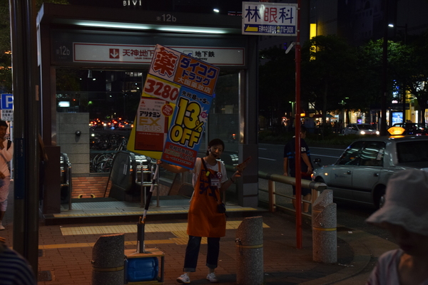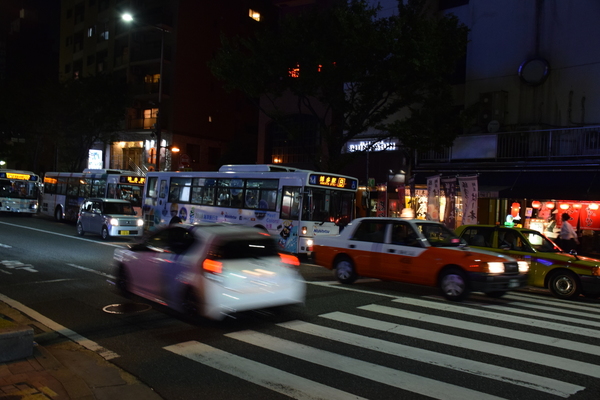 Weil ich doch noch das Haus verlassen habe. Schließlich ist das mein einziges Wochenende in Fukuoka. Und Fukuoka ist abgesehen vom derzeitigen Wetter so eine tolle Stadt. Also haben meine Mitbewohnerin und ich uns gegen sechs Uhr abends, als zumindest die Sonne nicht mehr so schlimm war, auf eine gefährliche, ungewisse Reise begeben. Natürlich haben wir uns im Konbini reichlich mit Wasser eingedeckt. Und dann ging es, äh, im Grunde zu der Haltestelle, an der wir auch zur Schule immer aussteigen. Aber dann das erste Abenteuer: Von hier ging es mit dem Bus weiter.