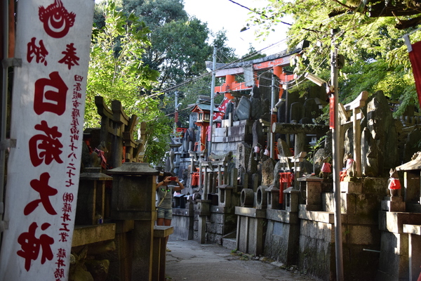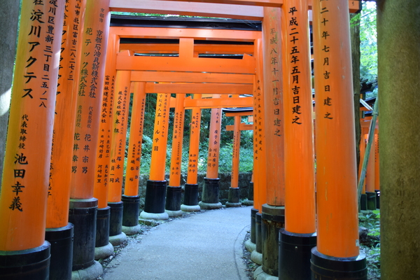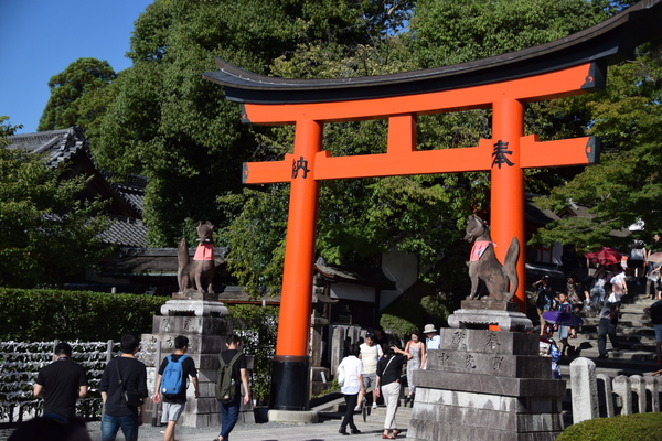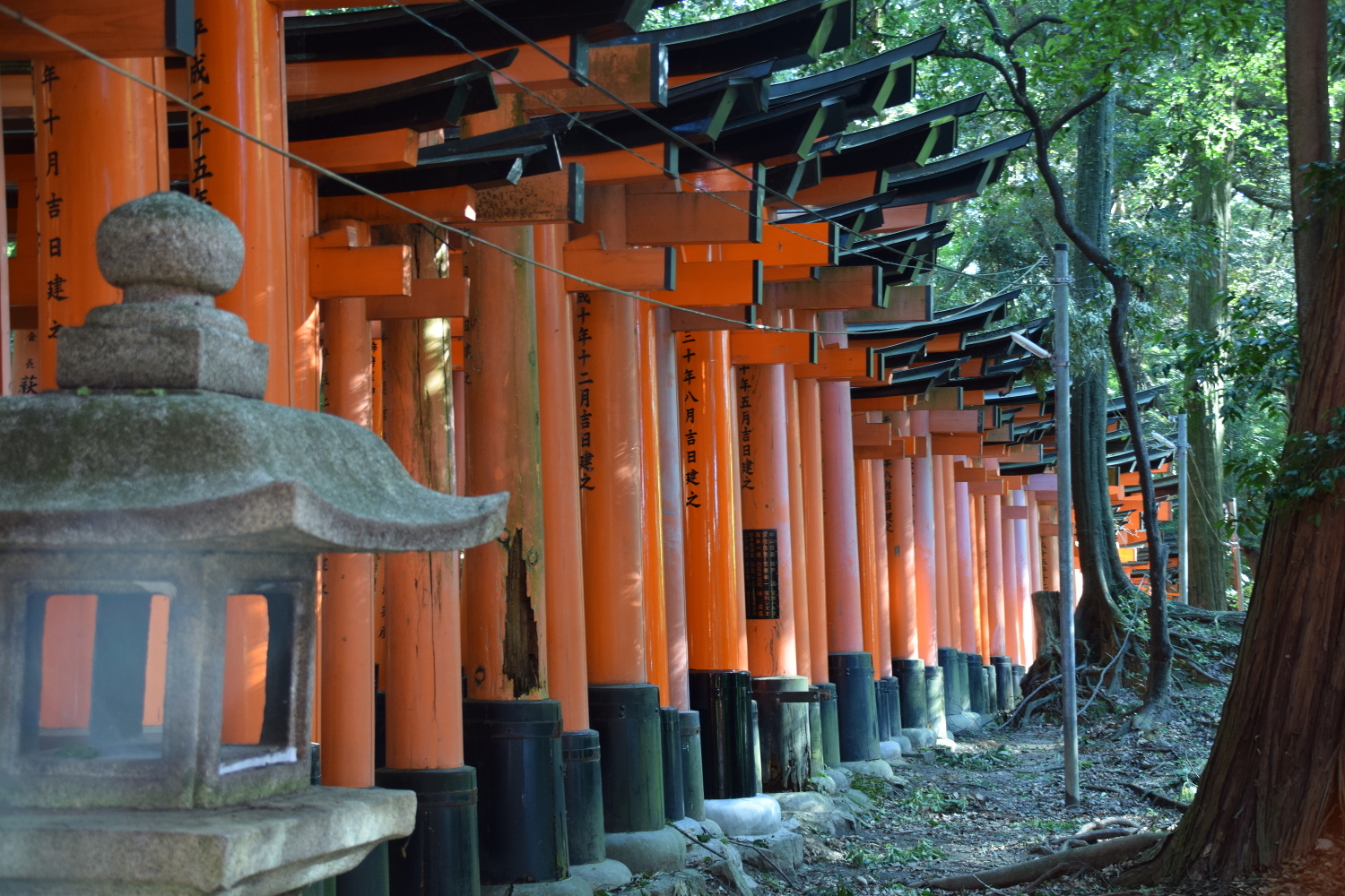 Fushimi Inari ist ein Tempel (Wappentier: Fuchs) und direkt hinter dem Tempel gibt es eine ganze Menge roter Tore, durch die man spazieren kann. Die gelten als eine der beliebtesten Touristenattraktionen in ganz Japan. Eine Erwartungshaltung war also vorhanden. Doch was dann wirklich zu sehen war, war... unerwartet. Es gibt nicht nur ein paar rote Tore, sondern... Hm, so ganz genau konnte es mir selbst das Internet nicht sagen. Der Legende nach mehrere Zehntausend. Aber ich würde eher schätzen, dass es "nur" ein paar Tausend waren. Die Tore sind allesamt Spenden von Unternehmen oder Privatpersonen, die sich davon Glück für ihre Geschäfte wünschen (oder die Sehenswürdigkeit unterstützen wollen). Im Gegensatz zu amerikanischen Ideen klebt dann aber nicht an jedem Tor ein dicker McDonalds-Aufkleber oder ein Apple-Logo, sondern man hält sich zurück. Sehr angenehm.