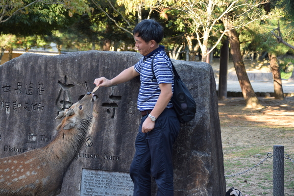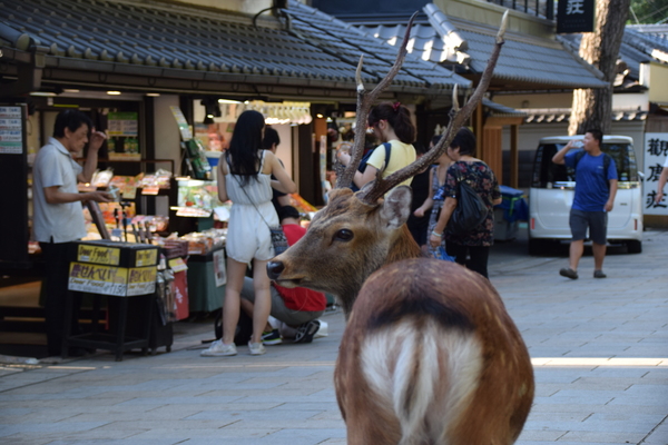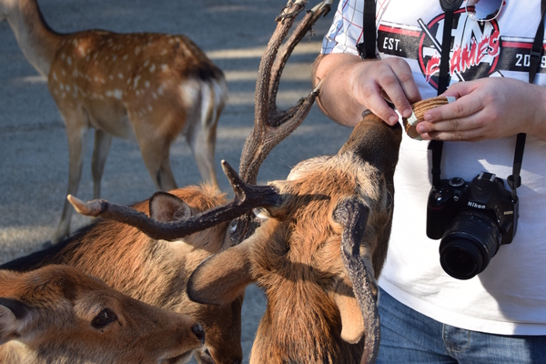 Im Park kann man für 200 Yen (etwa 1,50 Euro) einen Packen Rehkekse kaufen und die Rehe füttern. Eigentlich hätten wir das gar nicht tun brauchen, da auch so wirklich schon alles voller Rehe und Hirsche war. Aber hey, wann kann man schon mal Wild füttern, das nicht in Gehegen eingesperrt ist. Es stellte sich jedoch heraus, dass schon beim Kauf der Kekse die Rehe etwas unentspannt wurden. Während wir die Kekse kauften, wurden wir bereits von einem kleinen Hirsch dezent mit dem Kopf in den Rücken gestoßen. Und als wir dann die Kekse hatten, kam gleich eine ganze Horde an und wurde etwas aufdringlich. Einer der Hirsche hat mir sogar - natürlich ganz vorsichtig - in den Bauch gezwickt. Man fühlte sich dann doch ziemlich von den Viechern bedrängt. Eine weitere Erkenntnis: Wirft man einen Keks zur Seite weg, apportiert Wild nicht, sondern ignoriert das einfach. So musste man sich Schritt um Schritt von den Tieren zurückdrängen lassen und drauf aufpassen, dass nicht doch mal eins der Viecher nach einem Finger schnappt. Trotzdem ein sehr lustiges Erlebnis.