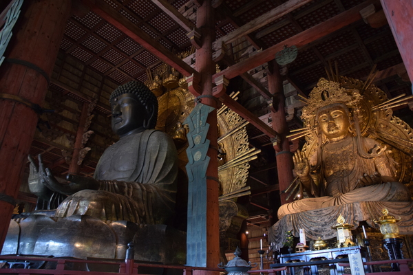 Der Park in Nara ist vollgestopft mit beeindruckenden Tempelanlagen, Museen und Zeug. Die Rehe sind wirklich überall (und man muss natürlich aufpassen, weil alles auch voller Rehscheiße ist). Unser Hauptziel war der Tōdai-ji. Ein riesiger Tempel mit einer riesigen Buddha-Statue. Der Tōdai-ji war mal das größte Gebäude, das ausschließlich auch Holz gebaut wurde. Mittlerweile gibt es unter anderem ein Baseball-Stadion in Japan, das größer als der aktuelle Tempel ist. Und der aktuelle Tempel ist vor im 17. Jahrhundert neu gebaut worden und etwa 30% kleiner als das Original. Heute hat der Tempel "nur noch" eine Höhe von 47 Metern. Ebenfalls bemerkenswert ist das Tor vor dem Tempel aus dem 12. Jahrhundert. Und schließlich steht mit 15 Metern Höhe in der großen Halle die größte Buddha-Statue aus Bronze der Welt. Die Buddha-Statue stammt aus dem 8. Jahrhundert und trieb Japan beinahe in den Ruin. Etwa 90.000 Handwerker sollen am Bau beteiligt gewesen sein, es wurden ganze Hügel eingeebnet und es brauchte viele Versuche, bis die gigantische Figur stand.