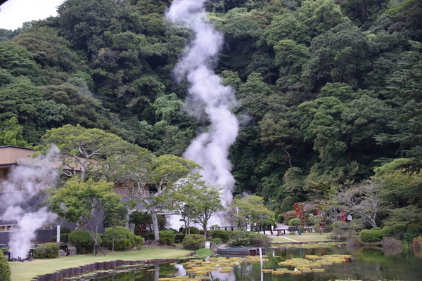 Umi Jigoku ist vor etwa 300 Jahren durch einen Vulkanausbruch entstanden und spuckt seitdem kochendheißes Wasser. Neben der blauen "Hauptquelle" gibt es noch eine braune Quelle, ein durch die Energie der heißen Quellen betriebenes Gewächshaus und in einem netten Garten ein - natürlich nicht mehr mit kochendem Wasser betriebenes - Fußbad. Da ist dann auch endlich passiert, worauf ich so lange gewartet habe: Ein Japaner (aus Tokio übrigens) hat mich gefragt, ob er ein Foto mit mir und ihm drauf machen darf. Ich bin berühmt. Das Fußbad war wirklich heiß, insbesondere wo wir eh noch über 30 Grad hatten. Aber insbesondere nach all der Herumrennerei der vorigen Tage eine wirklich erholsame Sache.