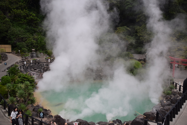 Schon am Eingang dampfte es aus einigen Löchern im Boden, allerdings so stark, dass ich das fast noch für künstlichen Rauch aus der Nebelmaschine gehalten hätte. Aber als wir dann die große, blaue Höllenquelle erreicht hatten, war der Dampf wirklich überall und meterhoch. Und es roch sehr auffällig nach Schwefel. Japaner lieben den Duft von Schwefel und trinken auch gerne gesundes, schwefelhaltiges Wasser. Mit einer europäischen Nase denkt man eher: "Es riecht nach Eiern, es riecht nach Eiern. Nicht nach... Nur Eier!".