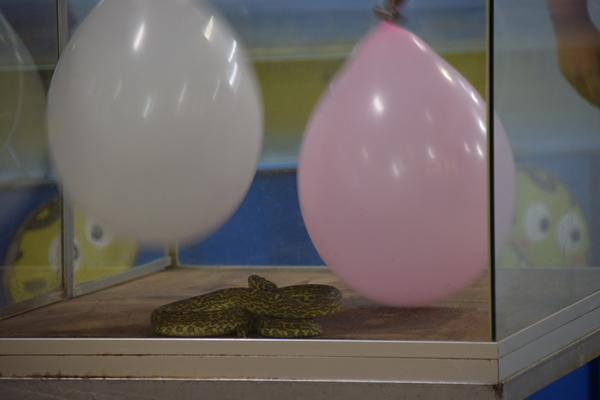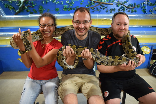 Die Schlangeshow dreht sich vor allen Dingen um Habu, die sehr unangenehme Giftschlange Okinawas. Das Gift der Schlange ist höchst unangenehm, bei rechtzeitiger Behandlung sind Bisse aber nur selten tödlich. Dennoch ist es nicht selten, dass bleibende Schäden nach einem Biss bleiben. Entsprechend sind Besucher Okinawas angehalten, möglichst Höhlen und dunkle Orte zu meiden. Früher bestand die Schlangenshow im Okinawa World aus einem spektakulären Kampf auf Leben und Tod zwischen einer Habu und einer Mungo. Zumeist gewann der Mungo, aber die Habu war nicht chancenlos. Heute ist die Population der Habu so weit dezimiert, dass solche Kämpfe nicht mehr stattfinden. Stattdessen gibt es ein etwas ödes Wettschwimmen zu sehen. Aber dennoch war's recht beeindruckend, so eine Schlange mal aus nächster Nähe zu sehen. Zum Abschluss gab es noch ein Erinnerungsfoto mit Python. Kann man machen, muss man aber nicht.