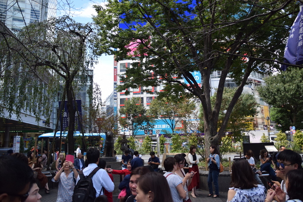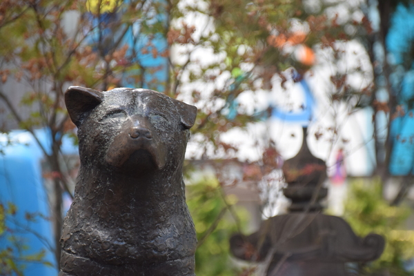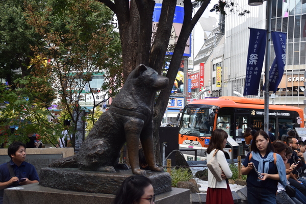 Nachdem wir einige Male wahllos über die Kreuzung gegangen und haufenweise Fotos geschossen haben, ging es auf zur nächsten Sehenswürdigkeit: Die Hachiko-Statue. Hachiko lebte in den 20er- und 30er-Jahren des letzten Jahrhunderts und war der Hund eines Tokioter Professors. Während der Professor an der Uni lehrte, wartete Hachiko an der Shibuya Station auf sein Herrchen. Nachdem der Professor starb, sollte Hachiko zu neuen Besitzern, riss sich jedoch los und kam weiterhin jeden Tag zur Shibuya Station um auf sein altes Herrchen zu warten. Bereits zu Lebzeiten wurde Hachiko in ganz Japan berühmt und galt als Inbegriff des treuen Vierbeiners. Heute erinnert eine Bronzestatue an Hachiko, zu deren Einweihung im Jahre 1934 Hachiko selbst zugegen war.