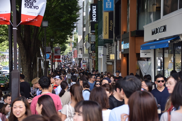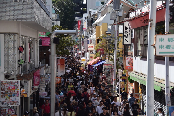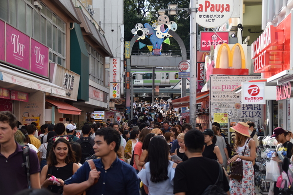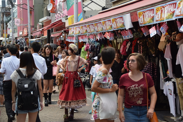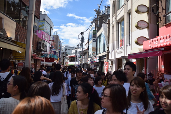 Für's Aufregen bleibt uns eh keine Zeit, wir müssen weiter, immer weiter. Nächster Stop: Takeshita Dori. Die Straße ist insbesondere bei jungen Leuten unglaublich populär. Hier ist selbst für Tokio-Verhältnisse alles nochmal drei Stufen schriller, bunter und verrückter. Es ist nahezu unmöglich den Straßenbelag zu sehen, so voll ist es in der engen Straße. Und es reiht sich ein flippiger Laden an den nächsten. Der Gothic-Schuhladen grenzt direkt an Cosplay-Läden, es gibt Läden, die hunderte verschiedenfarbiger Perücken verkaufen, oder Läden, die Klamotten verkaufen, mit denen man selbst auf der Bühne von Starlight Express noch auffallen würde.