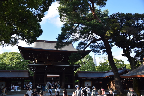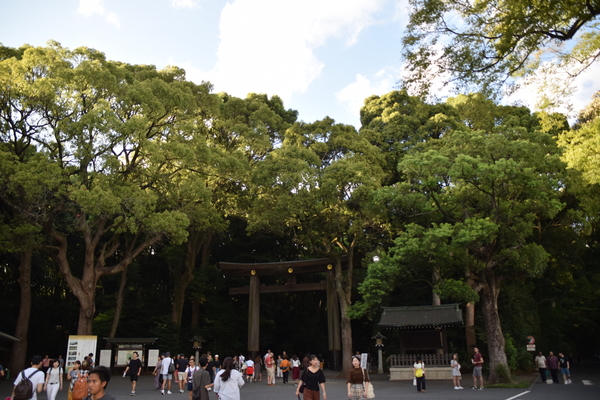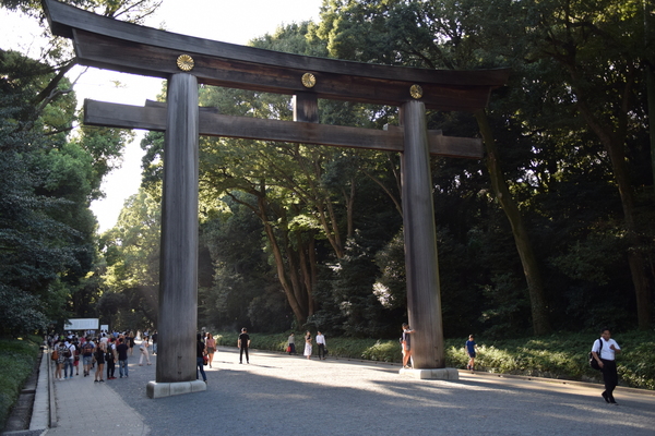 Der Meiji Schrein selbst ist ein ziemlich großer, aber dennoch ruhiger Schrein mitten im Wald des Yoyogi Parks. Leider wird auch hier gerade einiges im Hinblick auf die Olympischen Spiele (oder wie es der Schrein selbst ausdrückt: In Vorbereitung auf den 100. Geburtstag des Schreins...) renoviert und gebaut. Für uns hatte das aber auch einen kleinen Vorteil: Normalerweise ist es Besuchern strikt verboten, das Hauptgebäude des Tempels zu betreten. Durch die Bauarbeiten befindet sich aktuell allerdings der Goshuin-Stand im Eingangsbereich des Hauptgebäudes. Und so durften wir doch hinein und konnten uns einige Minuten lang anschauen, was sich in so einem Schrein abspielt. Leider gab es ein Fotoverbot, deswegen gibt es hier nur eine kurze Beschreibung. Im Gebäude selbst ist viel Holz verbaut, einiges an goldenen Verzierungen. Man merkt dem Gebäude an, dass es noch nicht allzu alt ist. Der aktuelle Bau ist aus den 60ern, nachdem auch hier den schusseligen Amerikanern im 2. Weltkrieg ein paar Bomben aus ihren Flugzeugen unglücklich in den Schrein gefallen sind. Während wir warteten, liefen ein paar - vermutlich - Mönchsnovizen in edlen, weißen Gewändern und mit traditionellen japanischen Bögen durch den Tempel. Man merkt schon, dass man sich an einer Art heiligem Ort befindet, aber es wirkt alles bei weitem nicht so überzogen theatralisch und depressiv, wie es das häufig in christlichen Einrichtungen tut. Abgesehen davon war der Schrein aber eher einer von vielen.