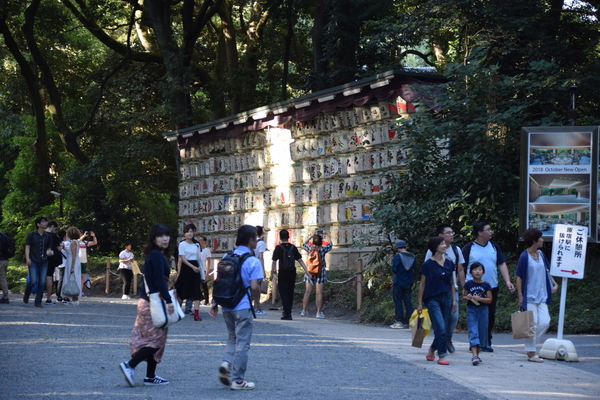 Und mit ähnlichem Kontrast ging es auch danach weiter. Wenige Meter nach der Takeshita Dori beginnt der Yoyogi Park. Der Park ist ein sehr beliebtes Naherholungsgebiet und insbesondere Sonntags stark besucht (wir werden hier "morgen" noch einmal vorbeischauen). Im Gegensatz zu westlichen Stadtparks besteht Yoyogi Park fast hauptsächlich aus ziemlich naturbelassenem Wald, durchzogen von ein paar breiten Wegen mit riesigen Toriis. Im Park liegt der Meiji Schrein, in dem die Überreste des extrem beliebten Kaisers Meiji und seiner Frau ruhen. In der Nähe des Haupteingangs des Yoyogi Parks befindet sich eine riesige Wand aus bunt dekorierten Sake-Fässern. Diese Fässer sind Spenden von Sake-Brauereien für Festivitäten im Meiji Schrein, die dann im Anschluss in der "Fässerwand" ausgestellt werden. Das Ganze ist schön anzuschauen und gleichzeitig ein weiteres gutes Beispiel, wie das Zusammenspiel von Religion, Kommerz und großer Geste in Japan funktioniert.
