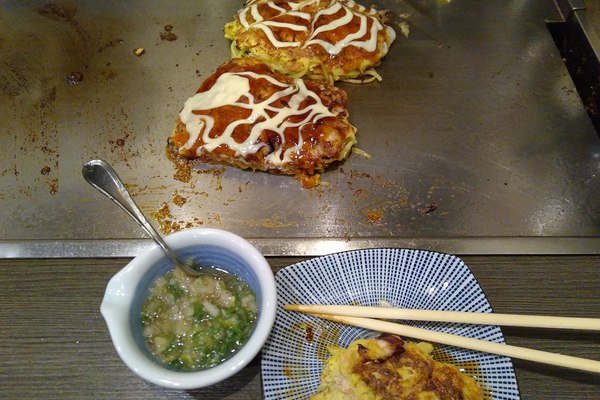 Nachdem wir dann auch noch den Schrein besichtigt hatten, ging die Sonne bereits unter. Es war mal wieder ein äußerst anstrengender Tag. Insbesondere der Irrsinn auf den wenigen hundert Metern der Takeshita Dori hat echt geschlaucht. Und auch wenn es merklich in Richtung Herbst ging, waren die Temperaturen auch immer noch im anstrengenden Bereich. So waren im Anschluss mal wieder sehr erschöpft, aber glücklich. Und weil dies unser letzter Abend in Japan sein sollte, gab es zum Abschluss nochmal etwas Besonderes zu essen: Leckeres Okonomiyaki! お好み焼き (also Okonomiyaki, wobei okonomi soviel bedeutet wie "wie Du es magst" und yaki "gebraten") ist eine Art Mischung aus Pfannkuchen und Omelett. In der Grundmasse ist in der Regel auch Weißkohl. Dazu wählt man meist ein paar Zutaten als Füllung aus, also zum Beispiel Garnelen oder Fleisch. Das Ganze wird dann scharf angebraten und bekommt dadurch unglaublich leckere Röstaromen. Der Laden, in dem wir Okonomiyaki gegessen haben, hat die Okonomiyakis auf einer Grillfläche auf dem Tisch zubereitet. Wenn man will, kann man das ganze Teil selbständig aus der Rohmasse zubereiten. Wenn man aber noch neu im Geschäft ist, kann man das auch von der Bedienung machen lassen und muss dann nur noch einmal umdrehen und warten, bis es fertig ist. Für mich definitiv eine der leckersten Speisen Japans, insbesondere nach einem kräftezehrenden Tag.