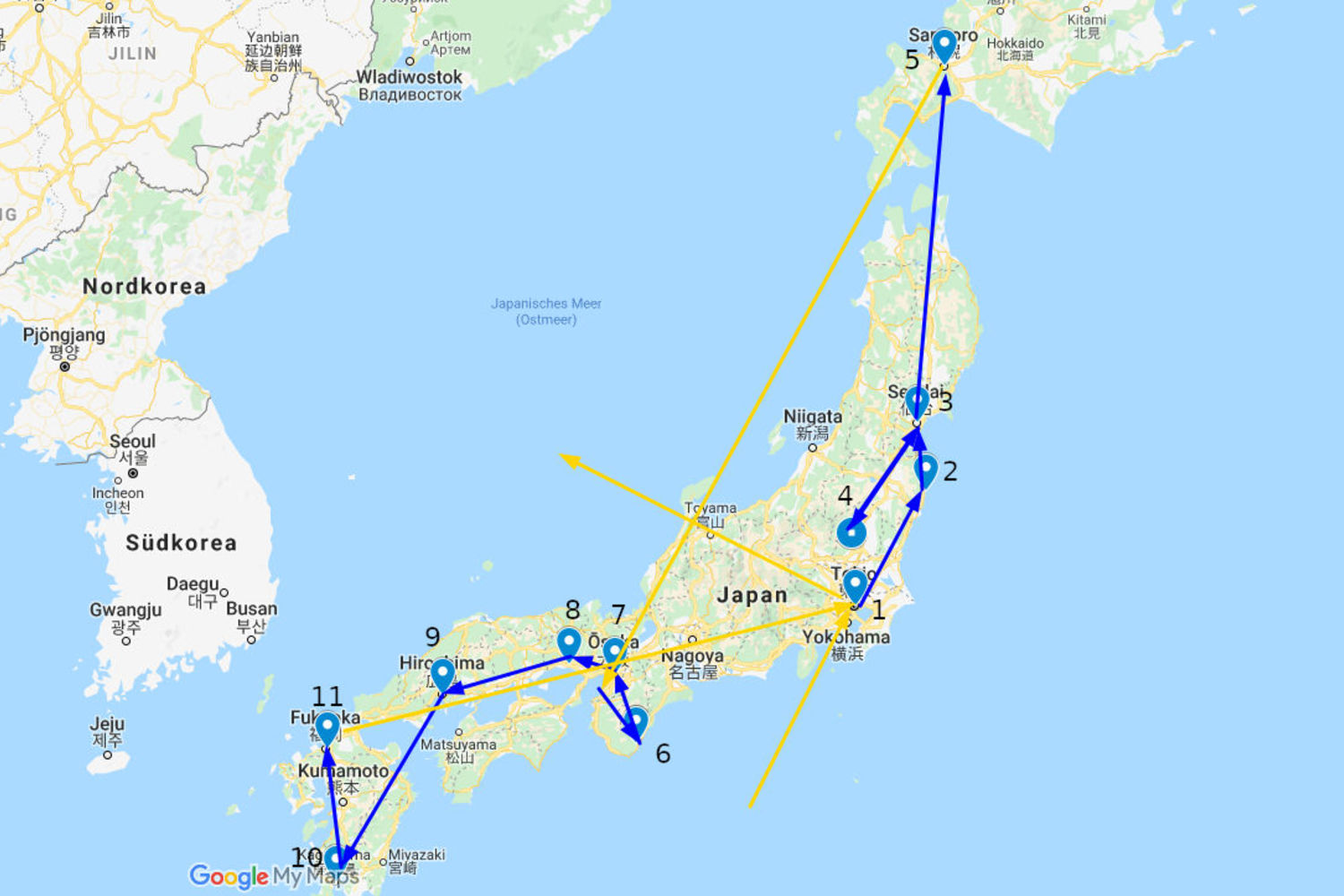 Den Rest der Reise kann man oben auf der wunderbar übersichtlichen Karte sehen. Gelbe Pfeile sind Flüge, blaue Zugfahrten. Es geht los mit dem gelben Pfeil von Süden von Ho-Chi-Minh-Stadt nach Tokio (1). Dort werde ich mich ein Tag erneut in den totalen Wahnsinn stürzen (Akihabara, ich komme!). Und vor allen Dingen möchte ich mir am 22. Oktober die Krönungsparade des neuen japanischen Kaisers Naruhito anschauen. Und natürlich jeden nur denkbaren Kaiser-Witz reißen. Hoffentlich sperren sie mich nicht ein.