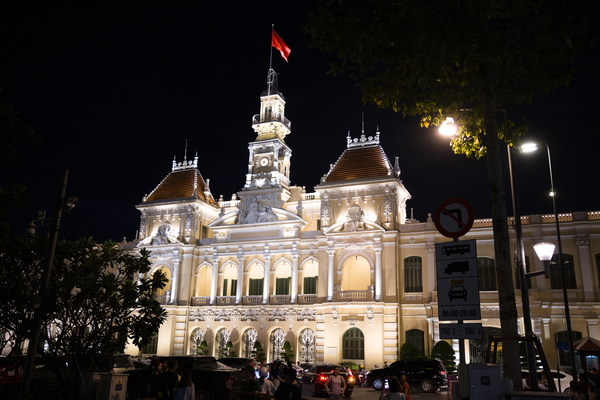 Irgendwann hatte mein Fremdenführer ein Einsehen. Ich durfte zurück in meine Zelle. Aber mit dem klaren Auftrag: Frischmachen für den Abend. Denn wir hatten noch lange nicht genug. Dann mal wieder ab auf den Roller und zurück in's Geschehen. Eine der Hauptstraßen wird abends zur Fußgängerzone umfunktioniert. Hier befindet sich auch das Rathause der Stadt. Das hatte ich am Vortag schon gesehen und dachte: Was ein schickes Haus, was ist denn das wohl? Direkt vor dem Rathaus steht eine Statue des großen Ho Chi Minh. Die ist aktuell allerdings leider mal wieder vollständig verpackt und wird wohl renoviert. Wer sie sehen möchte, muss also die Google Bildersuche befragen.