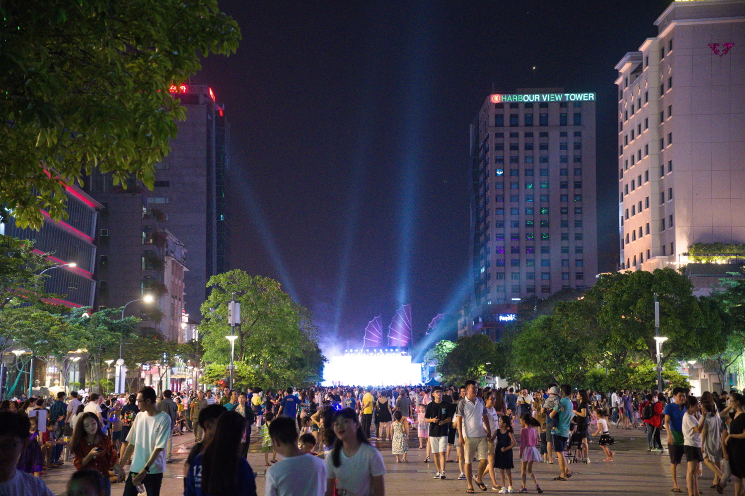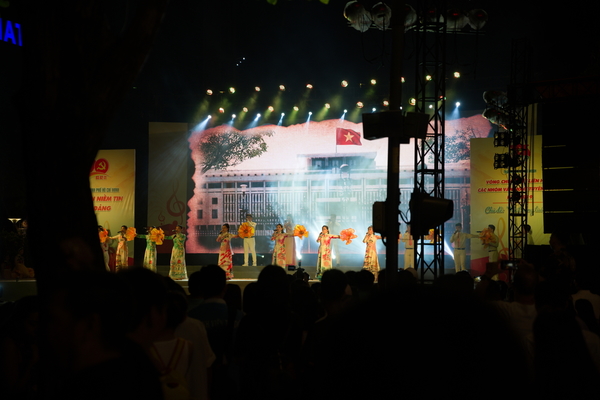 Es war aber auch kein ganz normaler Samstag in HCMC, am Ende der Walking Street war eine fette Bühne aufgebaut. Ich habe erst gedacht, Thore hätte das extra für mich organisiert. War dann aber doch nur eine nationale Festivität. Irgendwas ist 90 geworden und es gab eine fette Show zu Ehren von Ho Chi Minh und Vietnam, vermutlich. Die Show hat man sich ordentlich was kosten lassen. Aufwendige Videos, Choregraphien in aufwendigen Kostümen. Und einmal alles durch: Es wirkte wie eine Mischung aus Eurovision Song Contest, kommunistischer Propagandaveranstaltung plus viel vietnamesischer Kultur. Alles garniert mit viel Glitter und Enthusiasmus. Und auch für uns europäischen Riesenmenschen eine feine Show.