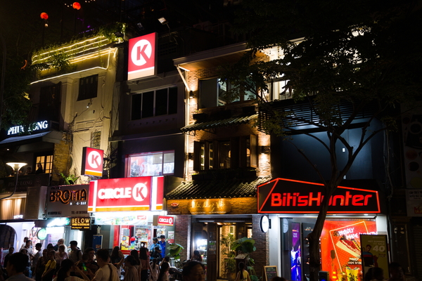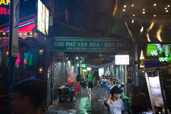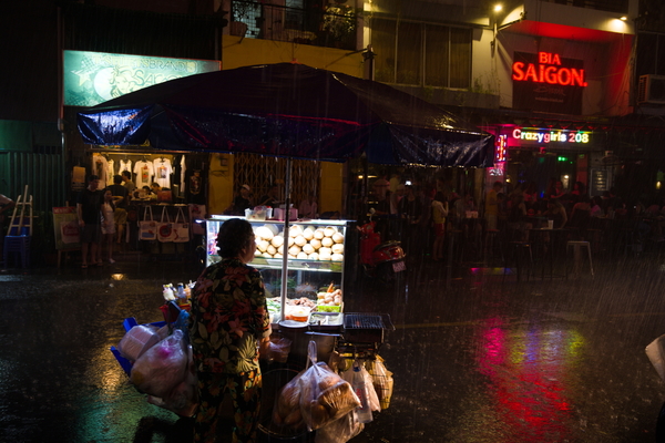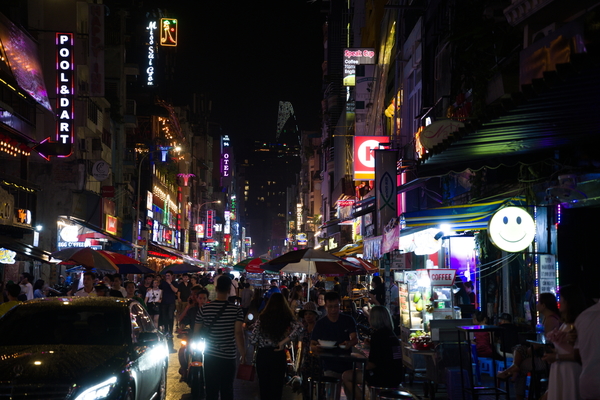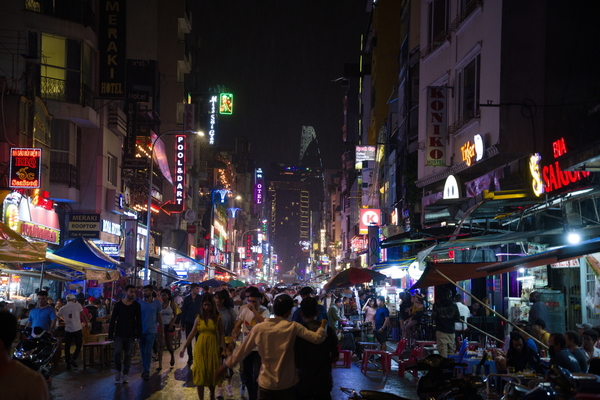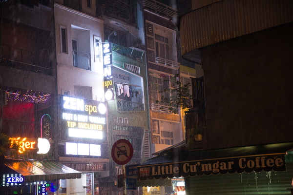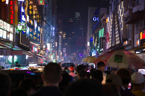 Als nächstes gab's einen Zug durch die Straße, in der sich die ganzen Backpacker treffen und auf den Putz hauen. Hier hat es ganz fürchterlich geschüttet. Dadurch konnte ich natürlich ein paar ziemlich geile Fotos ganz ohne Skill schießen: Sieht aus wie aus einem Cyberpunk-Film. Die häng ich auch noch unten an. Und auch hier gilt: Sollte ich das vergessen, bitte beschweren! Das Ganze ist ansonsten ein bisschen wie die Reeperbahn. Bunt, voll, dreckig, voller Abzocker. Aber schon deutlich größer als der Kiez und die Lautstärke ist tatsächlich kaum auszuhalten. Sollte man gesehen haben, aufhalten möchte ich mich da aber nicht länger als nötig.