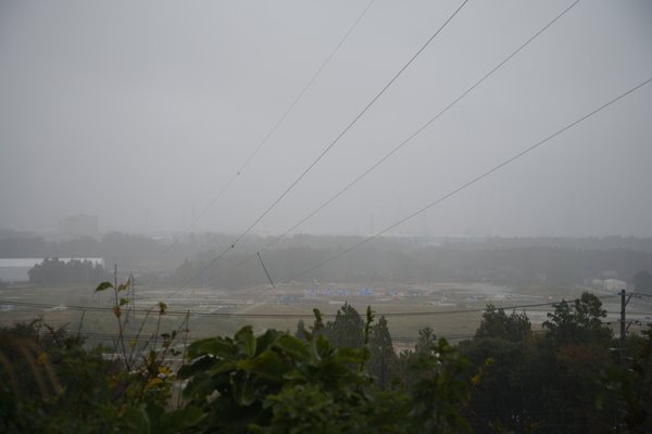 Neben dem Altersheim befindet sich eine kleine Anhöhe, von der aus man das Meer (angeblich; war zu viel Regen) und die Reaktorblöcke in etwa einem Kilometer Entfernung sehen kann. Da meine Hose schon wieder einigermaßen trocken war, bin ich kurz ausgestiegen für Fotos. Die sind natürlich wieder nicht so prima geworden. Aber besser als keine Fotos. Und erneut war es sehr seltsam, in diesem Gebiet draußen und im strömenden Regen zu stehen. Diesmal sogar mit direktem Blick auf die Reaktorblöcke. Zum Foto: Die Reaktorblöcke sind ganz hinten am Horizont leicht rechts zu erahnen. Das, was so ein bisschen wie überdimensionale Dixiklos aussieht.