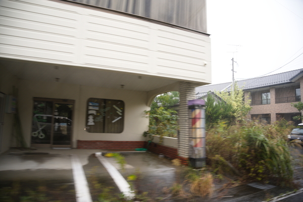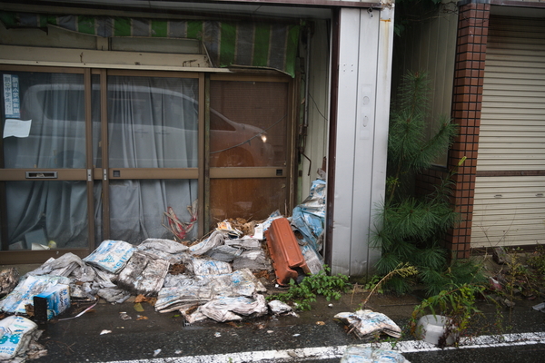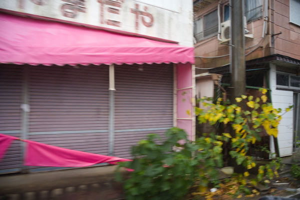 Weiter ging es nach Okuma, das auch noch in der roten Zone liegt, allerdings hoffentlich bald orange Zone werden kann. Hier wird entsprechend viel gebaut, unter anderem soll es einen neuen Bahnhof geben und dann bald die Joban Line wieder von Tokio bis nach Sendai durchfahren können. Wir haben die Hauptstraße des Dorfes besucht. Man kann erkennen, dass es hier früher wirklich mal ganz nett war. Einige kleine Läden, Eisdielen, Fahrradverleih, Friseur. Sicherlich ein kleines bisschen Naherholungsgebiet. Und jetzt sieht es aus wie die Kulisse für einen Endzeitfilm. Große Teile der Hauptstraße sollen demnächst abgerissen werden. Entsprechend durften wir hier ein wenig fotografieren. Weil es aber weiterhin wie aus Eimern geschüttet hat, haben wir das aus dem rollenden Auto gemacht. Und die langsam einsetzende Dämmerung (plus mein Kaumwaskönnen) hat die Qualität der Bilder auch nicht gerade positiv beeinflusst. Ein paar davon häng ich unten an.
