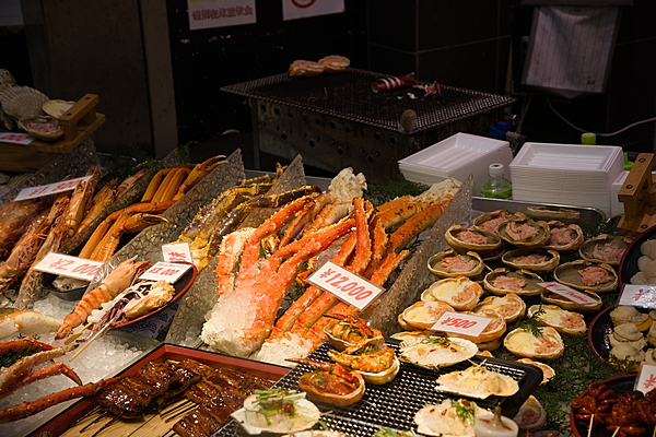 Leider signalisierte mein Magen, dass er am heutigen Tag nicht allzu viel Interesse an Geschmacksexperimenten hatte, weshalb ich mich diesbezüglich lieber etwas zurückgehalten habe. Zu gucken und riechen gab es aber reichlich. Ständeweise Meeresfrüchte, von den omnipräsenten Garnelen über geräuchtern Aal, sündhaft teure Seeigel bis hin zu noch teureren Beinen der Japanischen Riesenkrabbe. Diese Biester können ausgewachsen von Kralle zu Kralle bis zu fünfeinhalb Meter groß werden, behauptet Wikipedia. Sowas möchte man nicht unter dem Bett haben. Zum Glück halten die sich in der Regel in einer Meerestiefe von 400 Metern aus. Und gelten in Japan als Delikatesse. Ich habe weder Zeit, noch Interesse, noch Geld dafür.