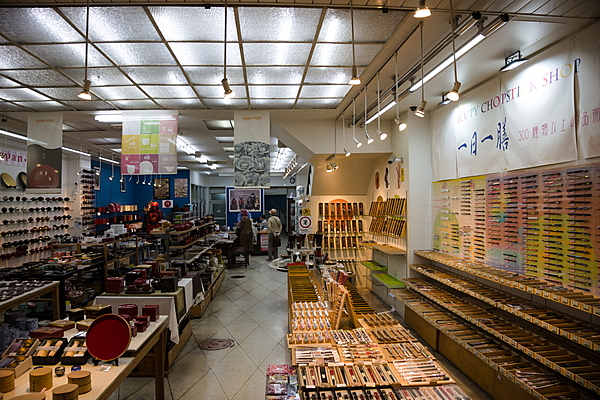 Abseits der Futterstände ist auf dem Markt relativ wenig los und es wird schnell gewöhnlich. Das ist aber gar nicht abwertend gemeint. Es gibt Läden, die Haushaltswaren verkaufen oder - deutlich spanennder - Restaurantaustattungen. Für Japaner bestimmt ziemlich uninteressant, für Westeuropäer gibt es einiges zu gucken und staunen. Und natürlich gibt es nicht nur einen Souvenier-Shop. Und endlich mal ein paar Stäbchenläden, die nicht danach aussehen, als wollten sie überteuerte Plastikware an unwürdige Touristen bringen.