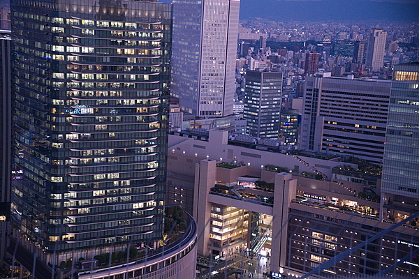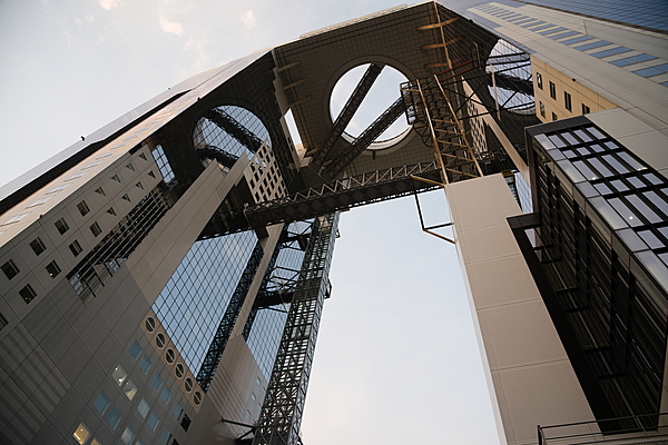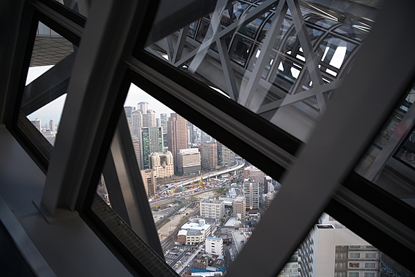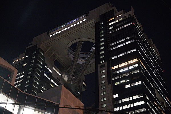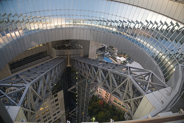 Wie viele extravagante Bauprojekte wurde das Gebäude in 80ern, als der Yen noch richtig Wumms hatte, geplant und Mitte der 90er fertiggestellt. Mit einer Höhe von 173 Metern ist es nicht sonderlich spektakulär hoch. Spektakulär ist eher die Form. Was man auf dem obigen Bild schon erahnen kann, besteht das Umeda Sky Building eigentlich aus zwei Hochhäusern, die (fast) nur auf den obersten Etagen miteinander verbunden sind. Zwischen den beiden Gebäuden auf den obersten Etagen befindet sich eine Aussichtsplattform und direkt darunter die (angeblich, so richtig bestätigen konnte das mein Freund Wikipedia nicht) höchsten freischwebenden Rolltreppen der Welt.