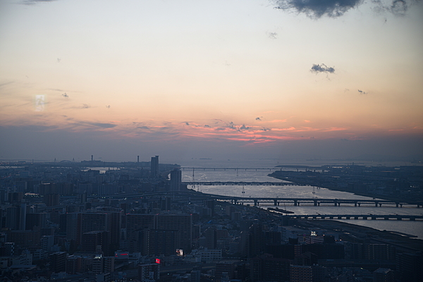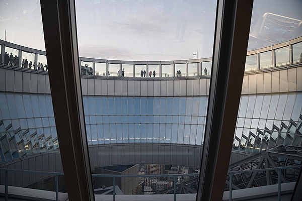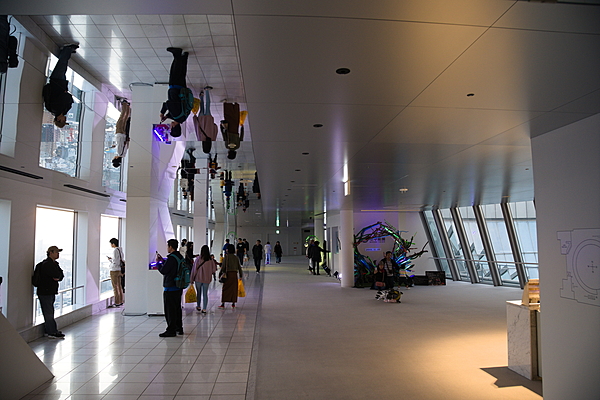 Die Fahrt war für mich gerade so gut an der Grenze. Ich hatte keine Probleme mit der Höhenangst, da alles sicher abgeschlossen wirkte. Der Blick zu den Seiten, insbesondere herunter auf den Boden verursachte aber ein leichtes Schaudern. Oben angekommen löhnt man dann einen fairen Obolus (700 Yen, also etwa 6 Euro) und kann auf die Aussichtsplattform. Es gibt eine sehr weitläufige, geschlossene Etage mit großen Panoramascheiben, ein paar ulkige Kunstwerke, viele Spiegel und leise Klassik im Hintergrund.