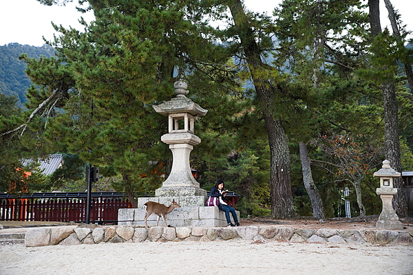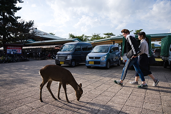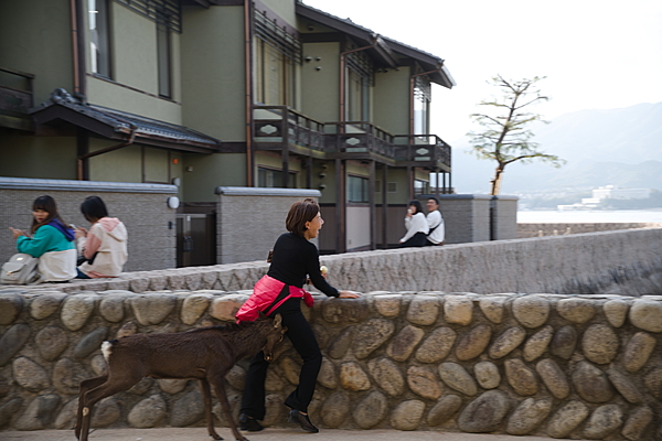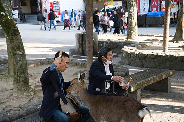 Als ich dann endlich auf Miyajima erreicht hatte, war es bereits nachmittag. So richtig viel Zeit blieb mir also nicht mehr bis zum Sonnenuntergang, aber auch kein Grund, sich zu stressen. Direkt hinter dem Bootsanleger gibt es einen größeren Parkplatz und hier wurde ich an ein Detail über die Insel erinnert, das ich vergessen hatte: Ähnlich wie in Nara ist die Insel von extrem zutraulichen Wild bevölkert, das auch hier schon langsam eher zu einer Plage wird.