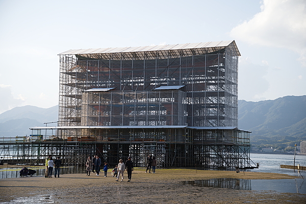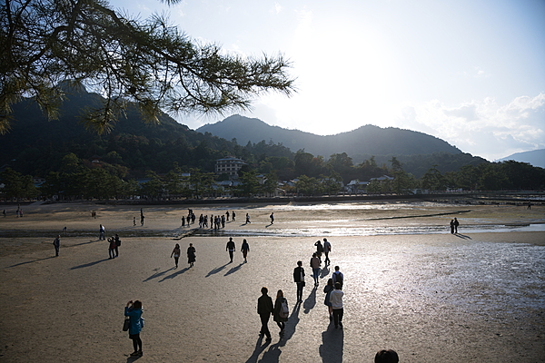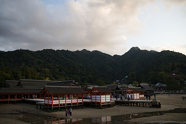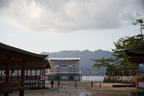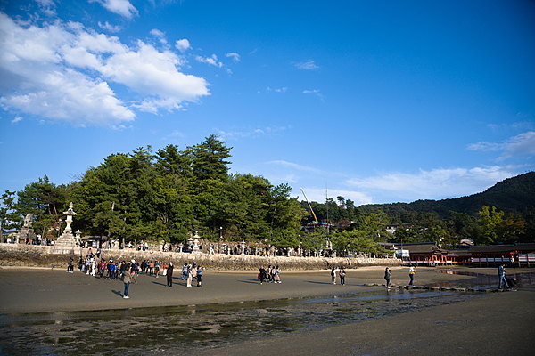 Weiter am Strand entlang biegt man um die nächste Ecke und steht quasi direkt vor dem Itsukushima-Schrein, zu dem auch das berühmte, im Meer stehende Torii gehört. Allerdings war das Torii nicht nur wie erwartet vollständig eingerüstet, sondern stand auch gar nicht im Meer. Vor Hiroshima gibt es nämlich recht starke Gezeiten und während meines Besuches war Ebbe. Das sorgt für einen deutlich weniger spektakulären Eindruck von Schrein und Torii, aber dafür kann man überall hinlatschen und gucken. Ein fairer Tausch.